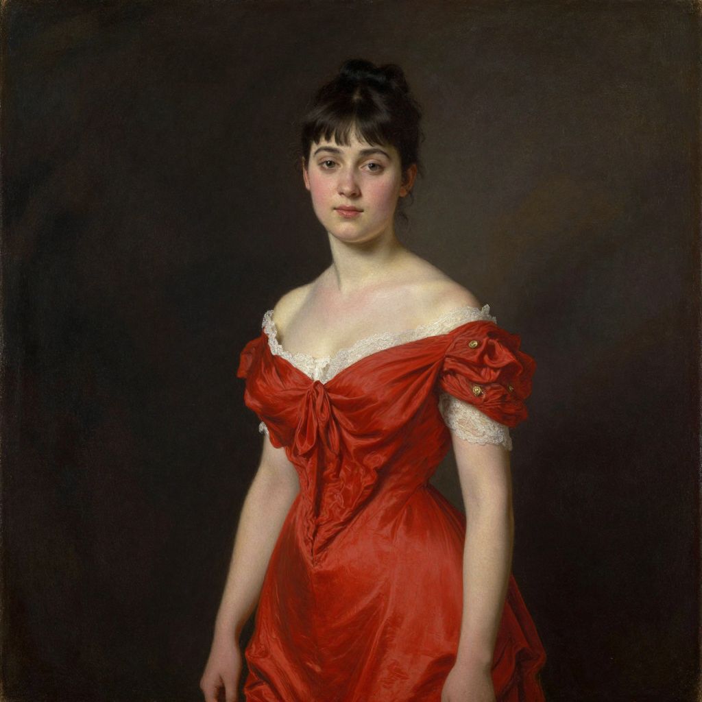 A classic oil painting from c.1892 depicts a young woman in a vibrant red dress with off-the-shoulder lace detailing, rendered in high-definition realism against a dark, moody background, showcasing the elegance and timeless beauty of Victorian-era portraiture.