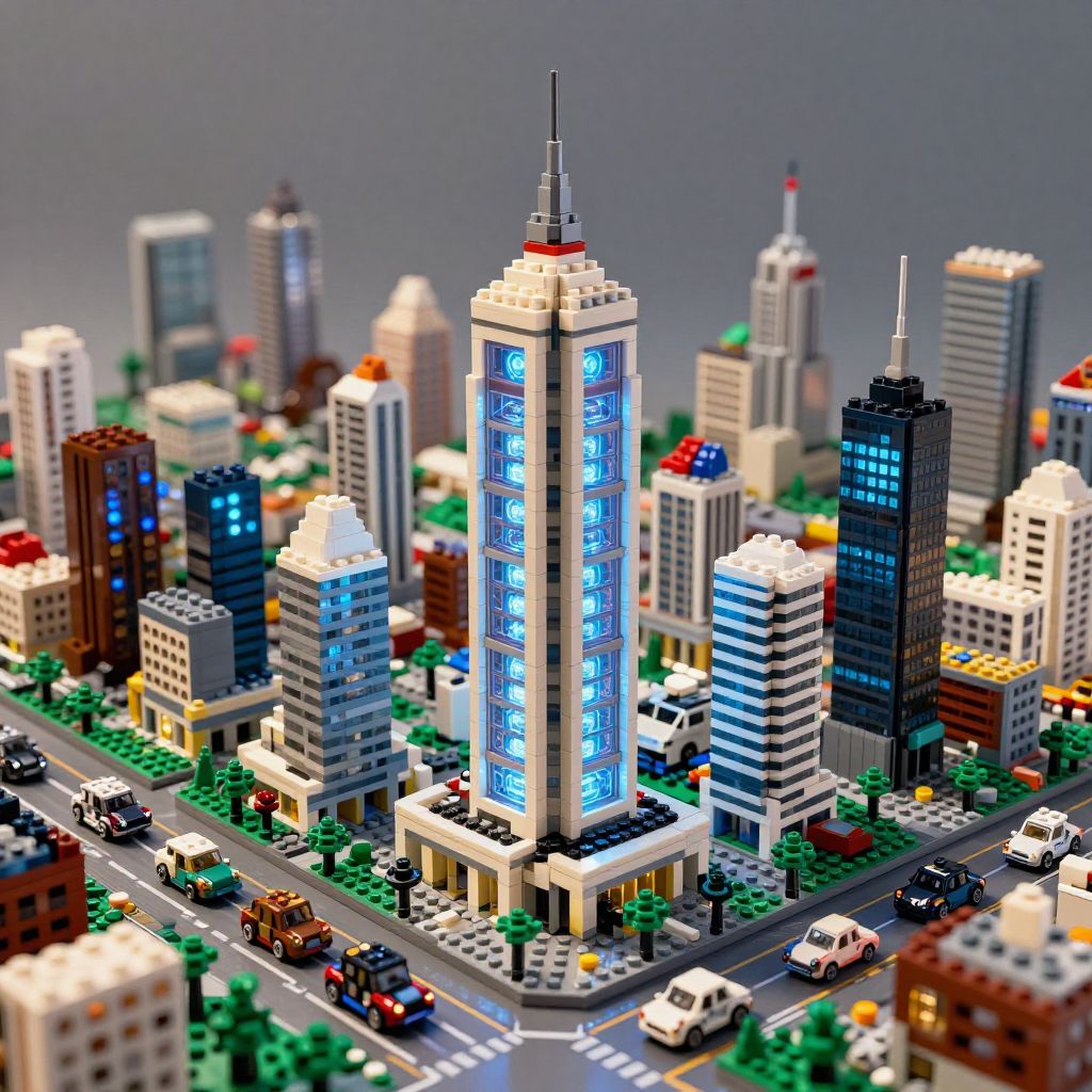 AI Lego cityscape, sprawling urban environment built entirely from LEGO blocks, featuring towering skyscrapers with glowing AI cores, busy streets with autonomous LEGO vehicles, enhanced with colorful lighting and dynamic shadows, photorealistic style.