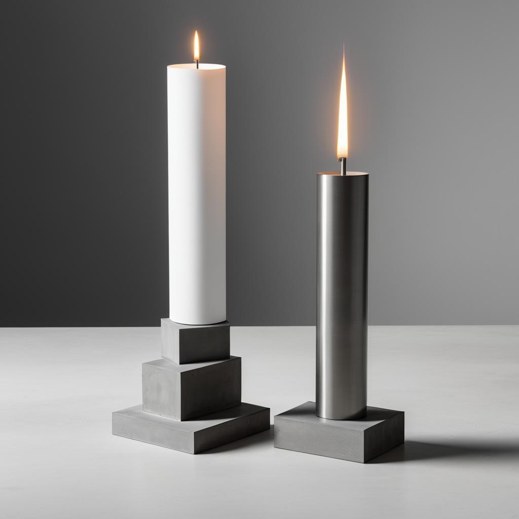 Assemblage a candlestick inspired by the brutalist architecture movement. The candlestick should be made of raw, unadorned materials such as concrete or steel, with a rugged, industrial feel. The design should incorporate sharp angles and geometric shapes, giving the impression of a decorative one. The overall aesthetic should be minimalist and utilitarian. The candlestick should evoke a sense of strength and solidity, while also conveying a sense of simple elegance. 8k, raw, brutalism, dslr, speedlight,