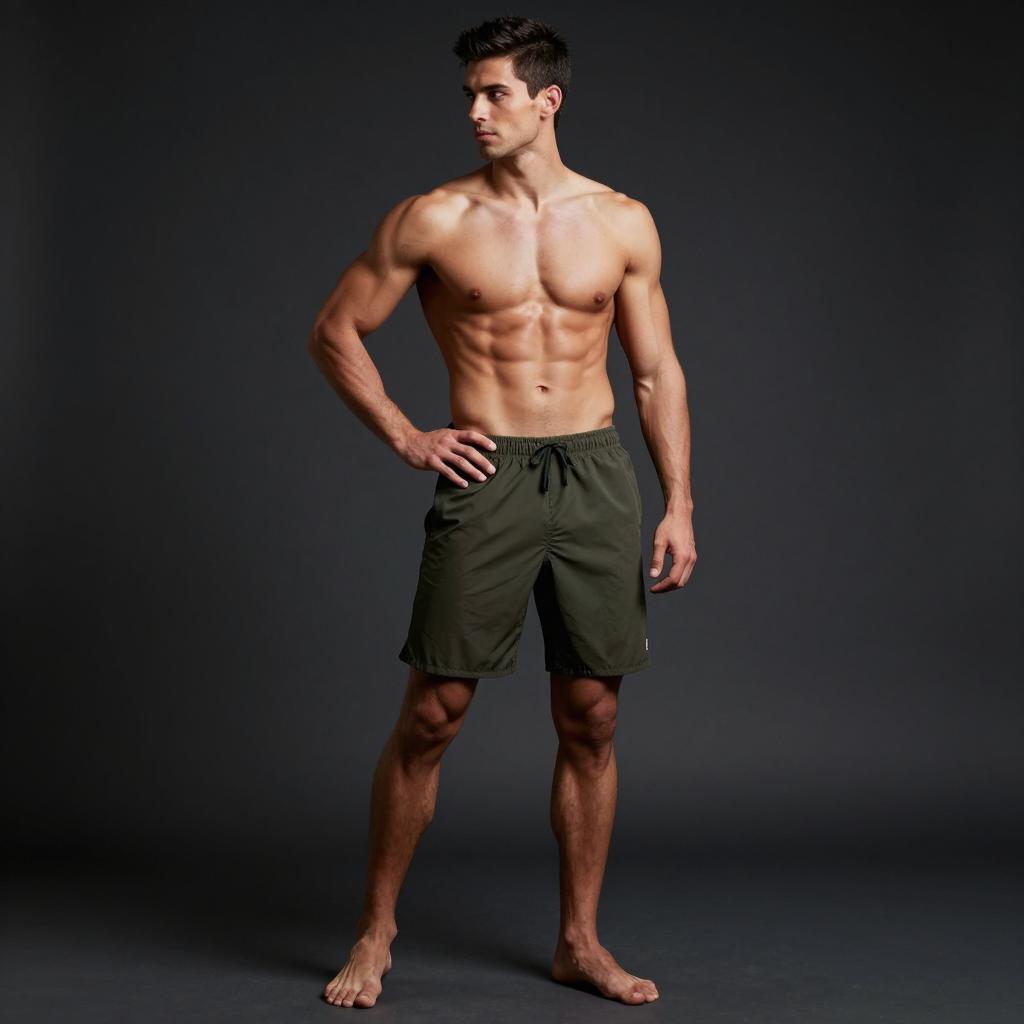 Full body portrait of fit man with sixpack abs, Mediterranean man with wavy short hair and stacked shoulders wearing navy compression shorts with subtle sheen and casually carrying sports bag strap hanging from one shoulder posed hands on hips, towel hanging loosely from one shoulder in solid charcoal grey background under moody low-key lighting with bright highlights along abs, ultra-detailed fitness portrait photography, 8k, sharp focus