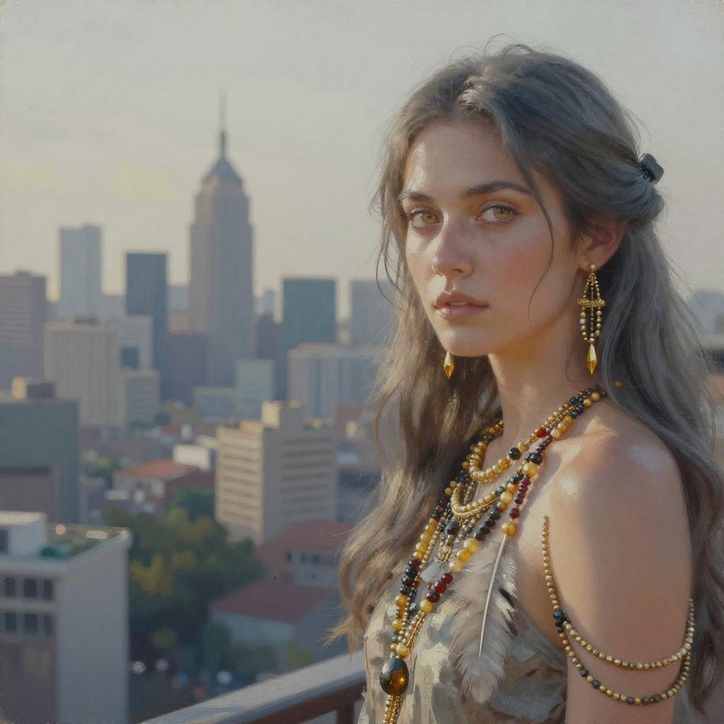 A landscape painting of a city skyline, inkpunkLandscapes768, f/1.4, square image, close up film photo, portrait of a female, grey long, gold eyes, feathers and bead jewelry, elegant pose, atmospheric lighting, cinematic composition, detailed, summer, filmgenre__