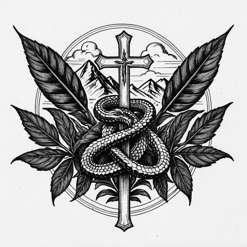 Tattoo Sketch of Serpent, Tobacco Leaves, Cross and Mountains