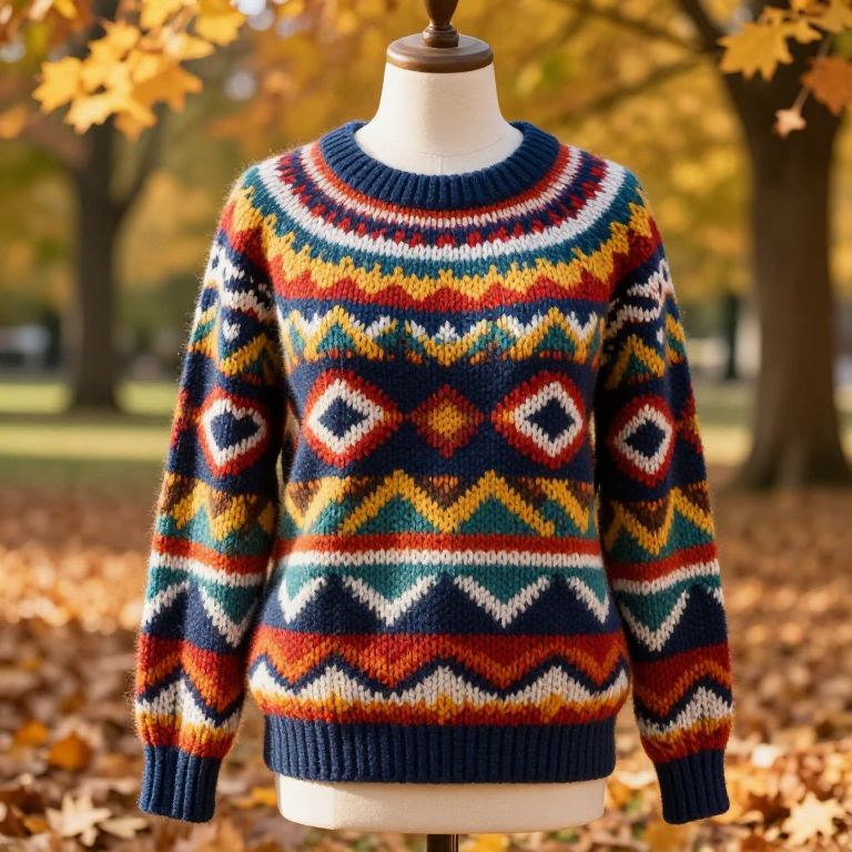 Knitted colorful sweater with bold geometric patterns displayed on a mannequin, vibrant autumn park scene in the background, falling leaves and soft sunlight creating a warm, inviting atmosphere, focus on texture and intricate knitting craftsmanship.