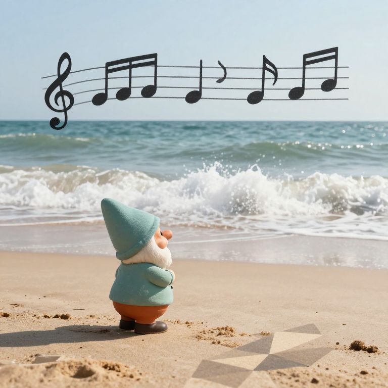 "Dwarf /imagine A serene beach scene with musical notes as waves crashing onto a shore of geometric patterns,"