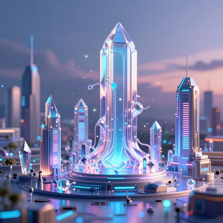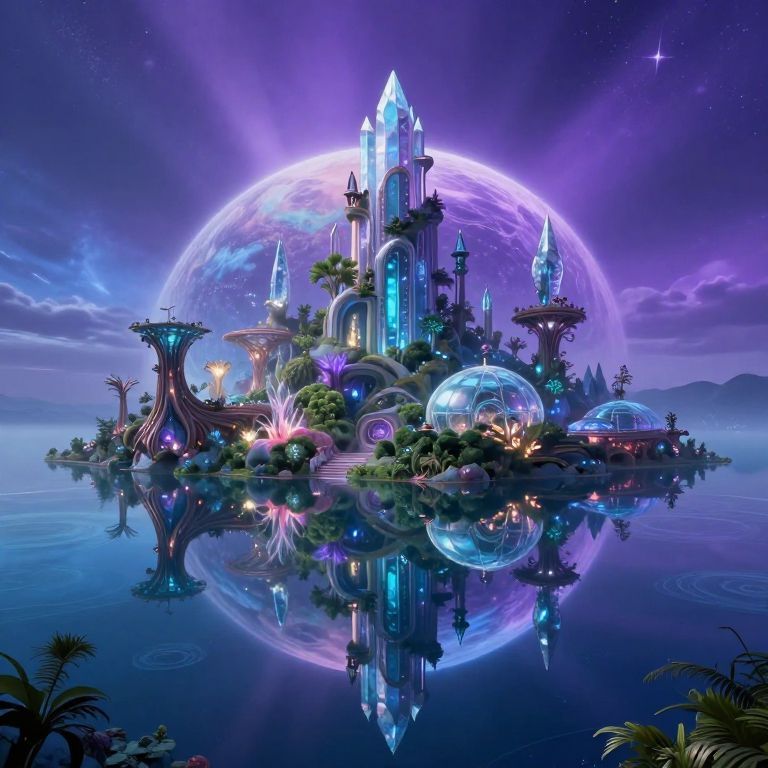 Digital art of a futuristic crystal castle at sunset, with glowing facets, surrounded by a cityscape with a vibrant purple and orange sky.