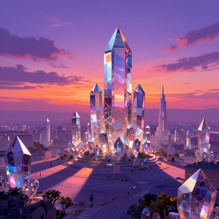 This digital artwork depicts a futuristic, crystal-like skyscraper at sunset. The towering structure, composed of multiple faceted, glowing crystals, dominates the center. Its reflective surfaces capture and emit vibrant purples, blues, and oranges from the sunset sky. Surrounding the main building are smaller, similarly faceted crystal structures. The background features a sprawling cityscape with a tall, slender skyscraper visible on the right. The ground is a mix of paved pathways and patches of greenery. The sky transitions from deep purple to bright orange, with scattered clouds. The scene is illuminated by the warm and cool colors of the sunset.