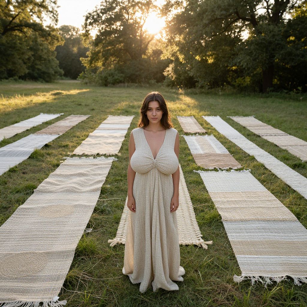 A serene outdoor landscape at sunrise with interconnected woven fabrics forming a living tapestry across a grassy meadow, showing threads blending seamlessly into the natural environment, featuring a woman with soft brown eyes and warm skin standing in the center, wearing a flowing fabric dress that matches the cohesive design of the surrounding textiles, sunlight filtering through the canopy of trees, realistic photography style.. The woman has big tits and cute face
