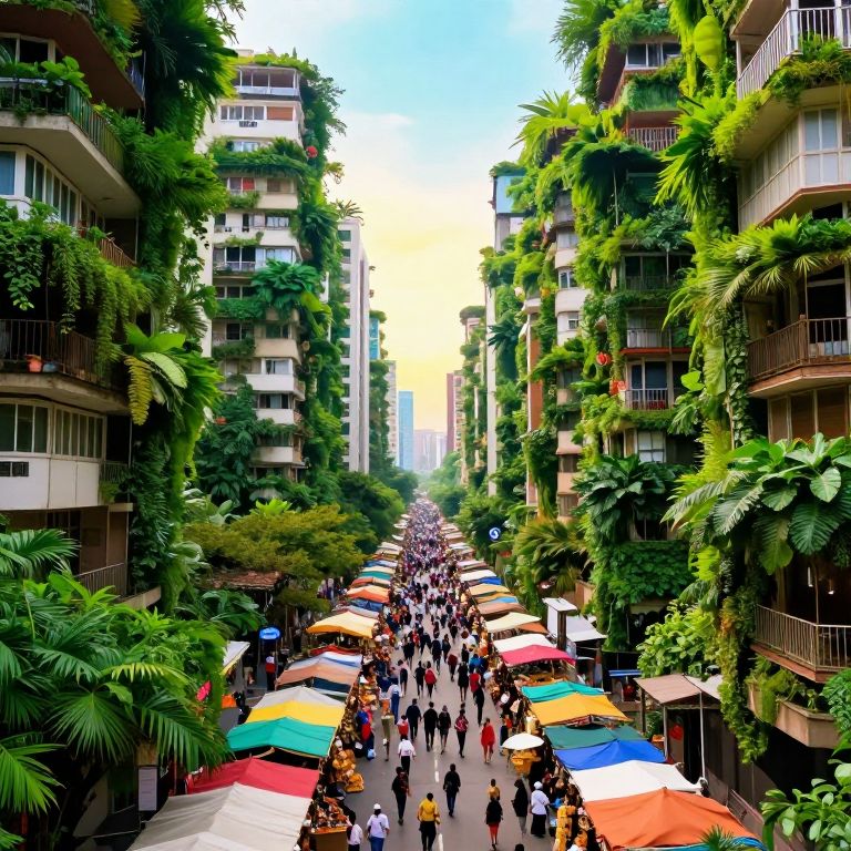Lush greenery cascades down modern apartment facades, framing vibrant street markets with red awnings and golden-baked goods, creating a serene urban oasis under a clear blue sky.