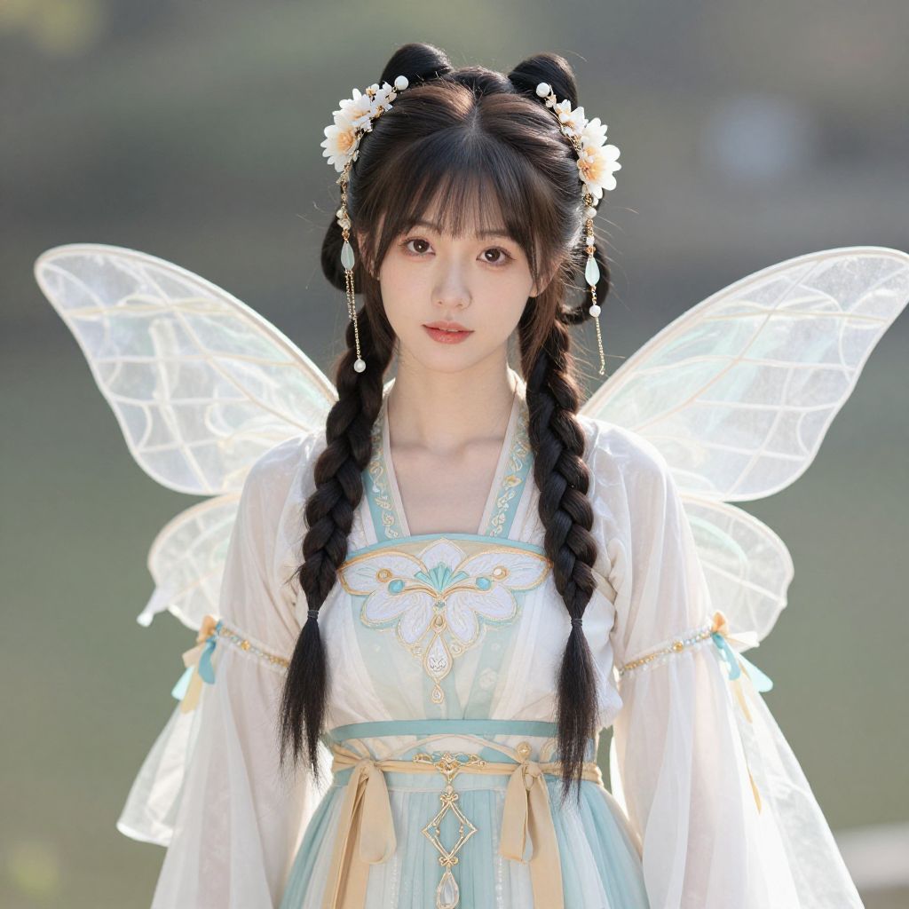 A young woman dressed in an elegant traditional costume with long braided hair adorned with floral hair ornaments, posing outdoors with delicate fairy wings. The image blends elements of cosplay and fantasy, featuring a serene expression and soft natural lighting that highlights the intricate details of the outfit.