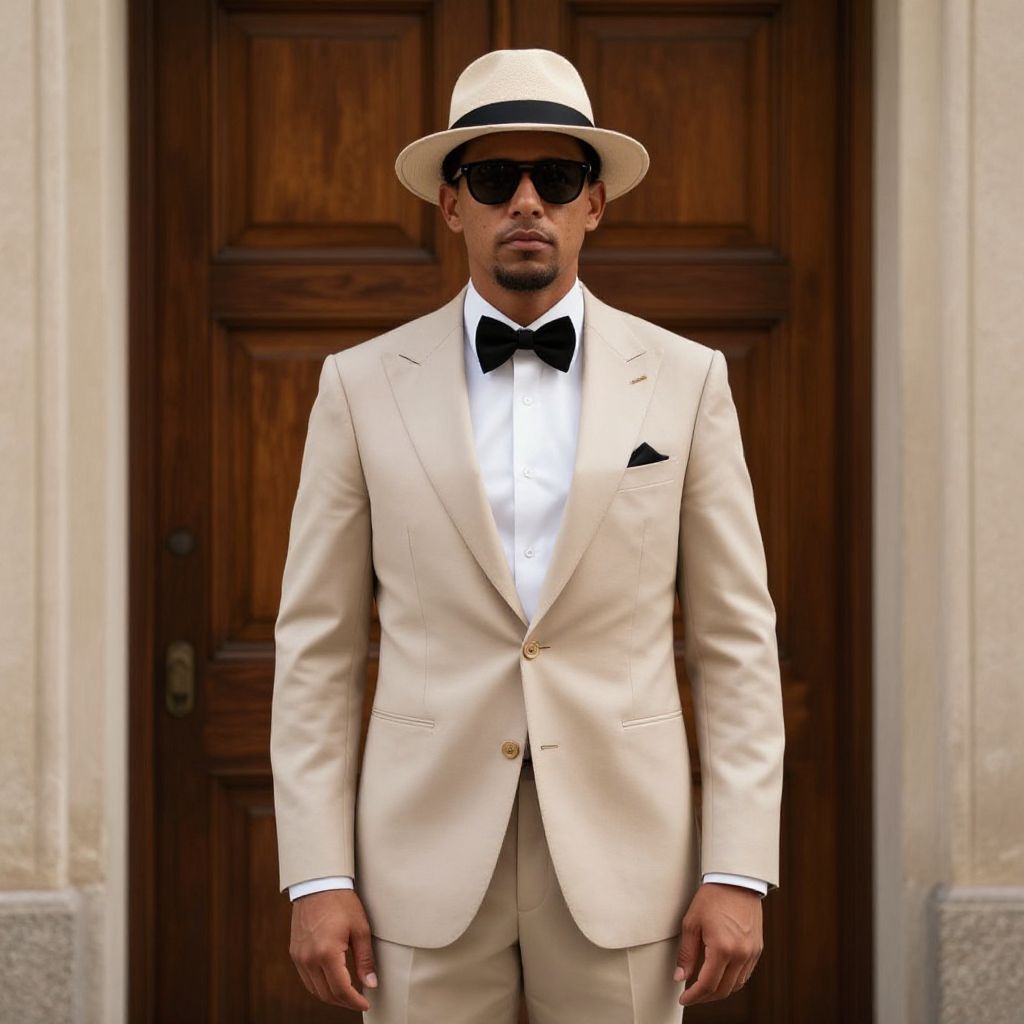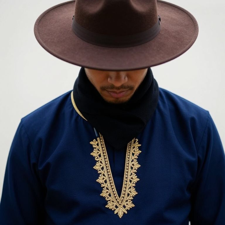 A person is wearing a dark blue outfit with gold embroidery on the chest and a black scarf around their neck. The person is also wearing a brown hat with a wide brim on top.