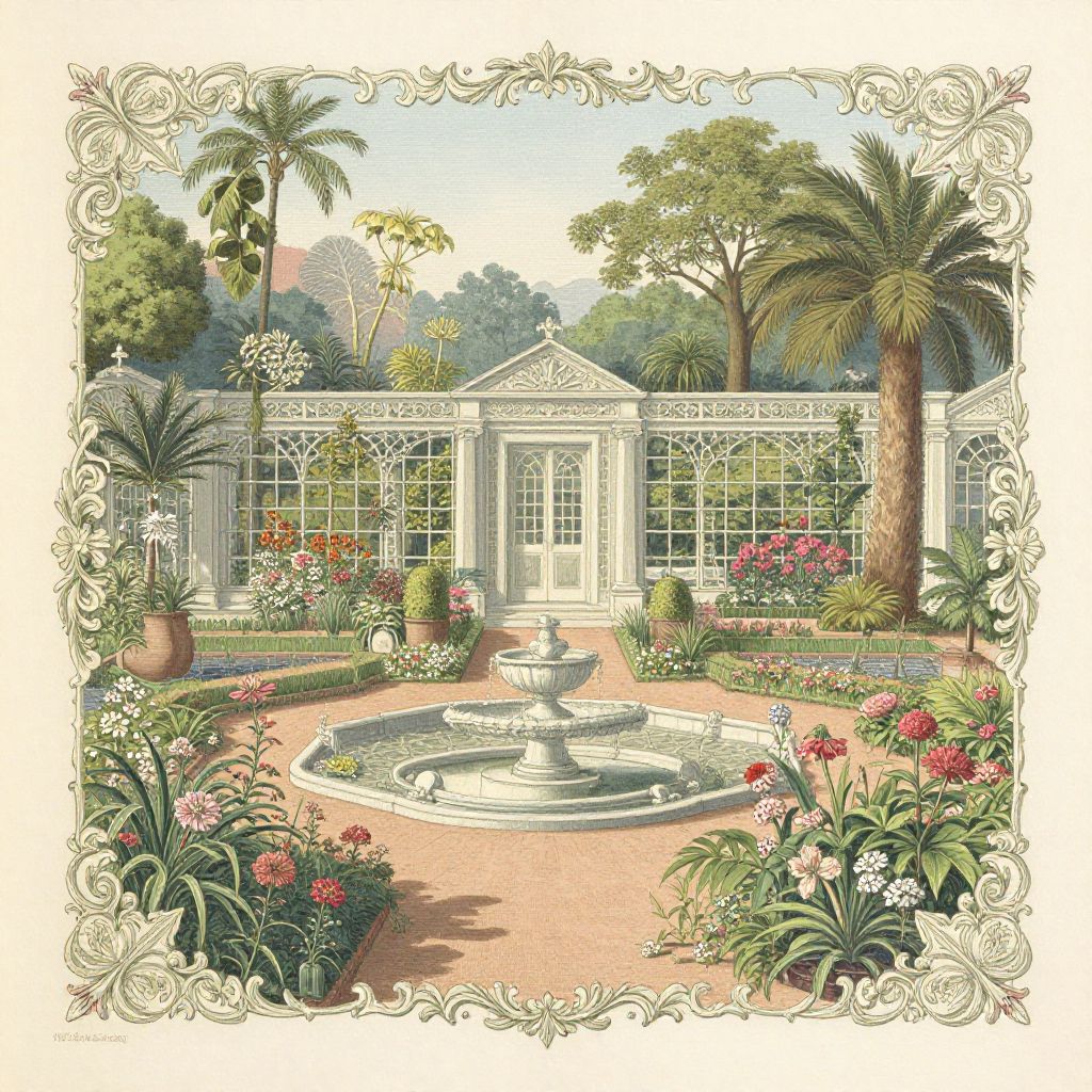 Pictorial scene of a lush vintage botanical garden with intricate floral patterns and soft natural lighting, capturing the essence of a timeless illustrated manuscript, delicate color palette, and elegant composition.