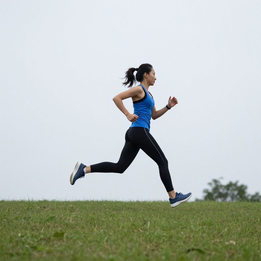 Photograph of a fit woman with dark hair in a ponytail, wearing a blue tank top, black leggings, and blue sneakers, running on a