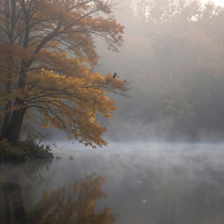 Photograph of a misty autumn morning by a tranquil pond. A large, leafy tree with orange and brown foliage stands on the left, its branches extending over the calm water. A small bird perches on one of the branches. Dense fog blankets the background, creating a dreamy, ethereal atmosphere. The water reflects the tree and mist, adding to the serene ambiance. The scene is peaceful, with soft, muted colors and a gentle, early morning light filtering through the fog.