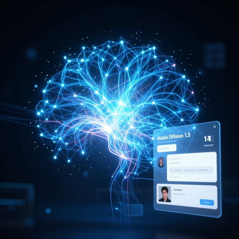 Conceptual image of stable diffusion 1.5 online as a powerful AI engine visualized through glowing neural network connections, digital particles flowing dynamically, with a transparent floating user interface overlay showing prompt inputs and generated images, set in a dark cybernetic theme.