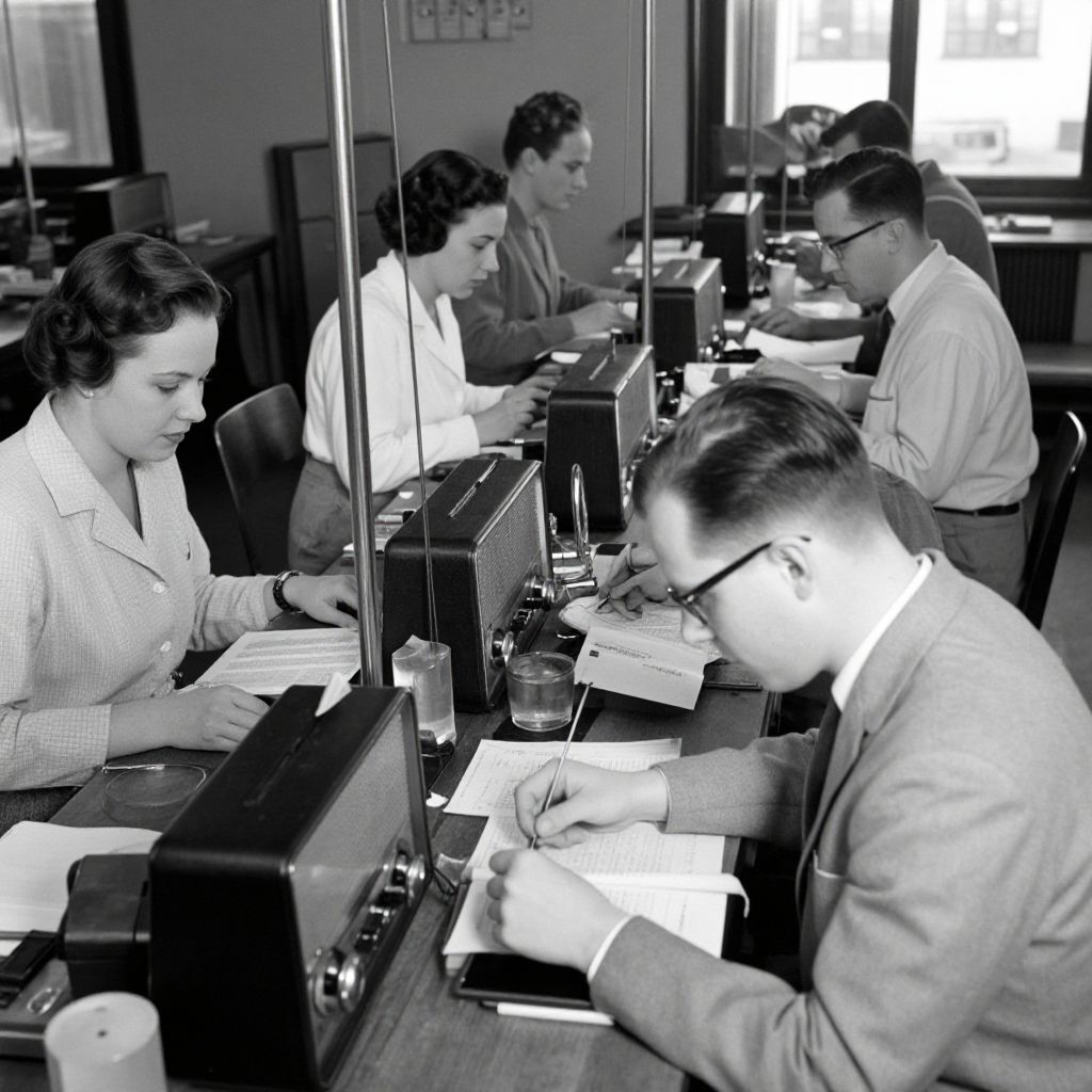 Black-and-white photograph of six 1950s office workers, men and women, typing and writing at desks with vintage typewriters and telephones
