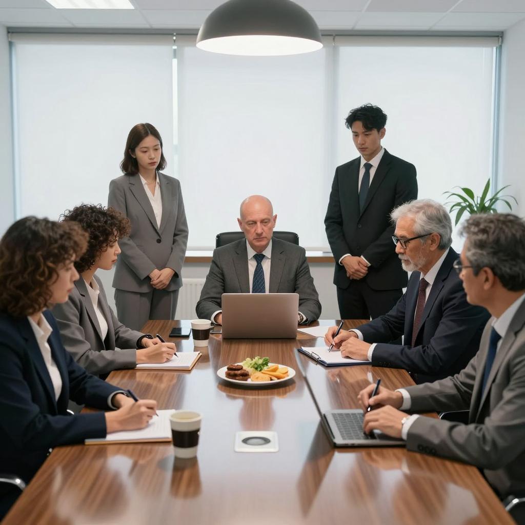 Business meeting in a modern office. Seven people, six men, one woman. Seated around a glossy table, taking notes, discussing. Two standing, observing. Overhead light, large windows with blinds. Table with coffee cup, plate of food, documents, laptop. Formal business attire. Bald man with blue tie in center, woman with curly hair on left, grey-haired man with glasses on right. Serious expressions.