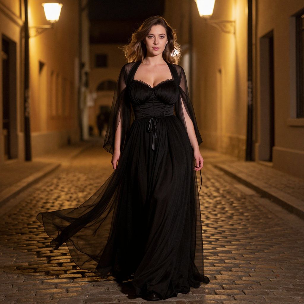 Photograph of a confident young woman with light skin and straight brown hair walking down a cobblestone street at night. She wears a floor-length, black, sheer gown with a deep V-neck and flowing sleeves, which billows slightly in the breeze. The street is lined with warm, yellow-lit street lamps and beige, historic-style buildings. The background is blurred, focusing attention on her. The overall ambiance is romantic and elegant, with the warm lighting contrasting against the dark dress and cobblestones.