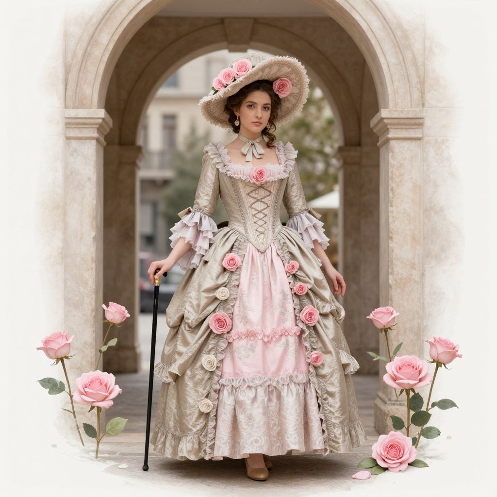 In this urban sketch, a woman dressed in a Rococo-style gown stands elegantly in a grand archway, her attire adorned with intricate details and a flowing skirt. The dress, a harmonious blend of beige and pink, features ruffled sleeves and a corseted bodice, accentuated by a large, ornate hat decorated with pink roses. The woman holds a walking cane in her right hand, adding a touch of sophistication to her posture. Surrounding her are delicate pink roses and leaves, scattered in a seemingly random yet aesthetically pleasing manner, enhancing the romantic and whimsical atmosphere of the scene. The background, a blend of architectural elements and soft, muted colors, provides a contrasting backdrop that further emphasizes the woman's attire and the delicate floral elements. The overall composition is balanced, with the woman centrally positioned, drawing the viewer's eye to her as the focal point of the image.