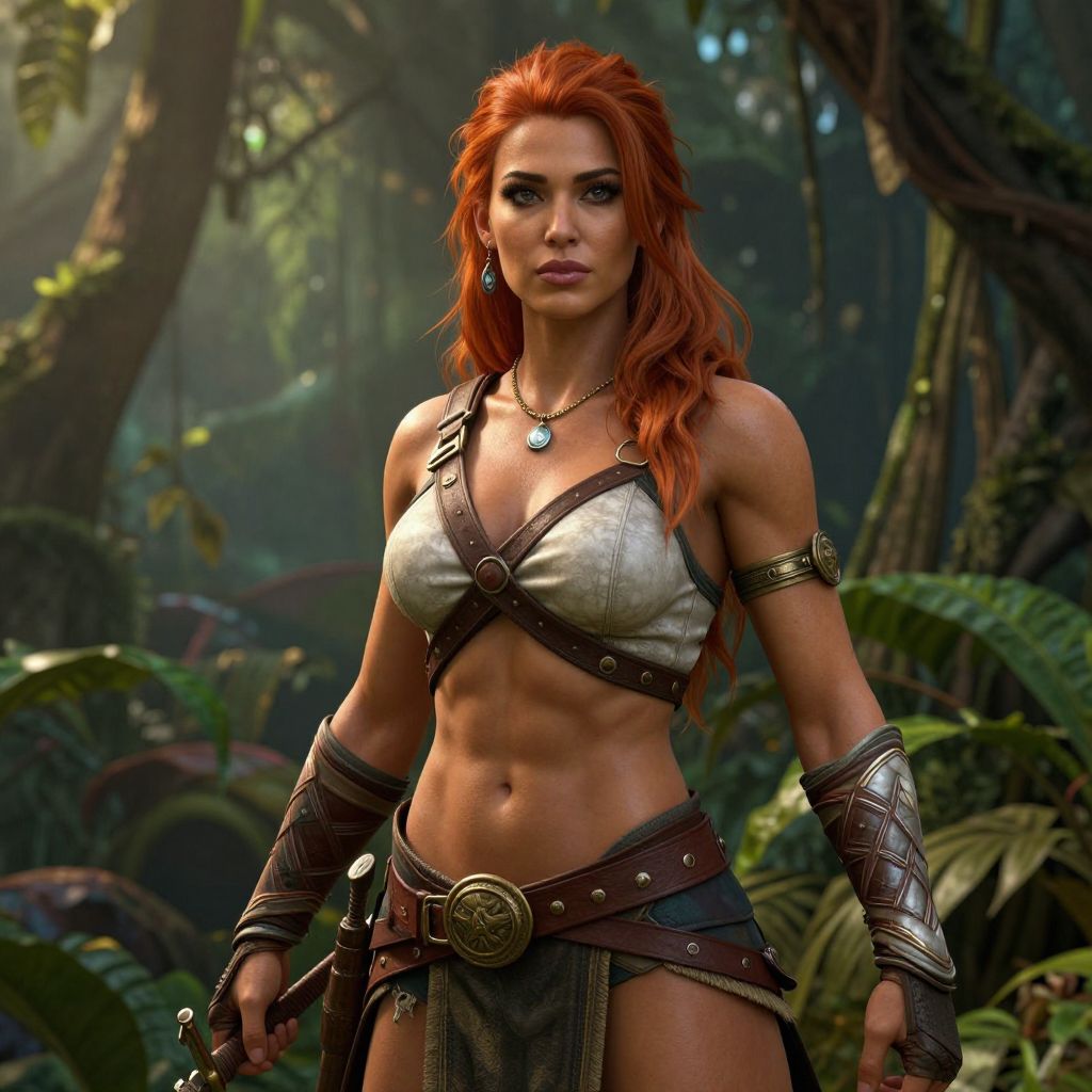 Digital artwork of a muscular, red-haired woman with fair skin, wearing a metallic bra and brown leather armor, standing in a lush, sunlit jungle