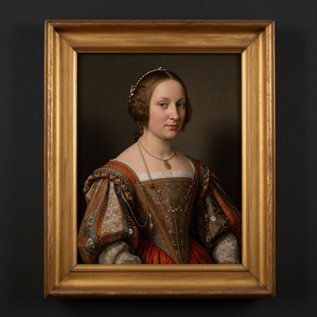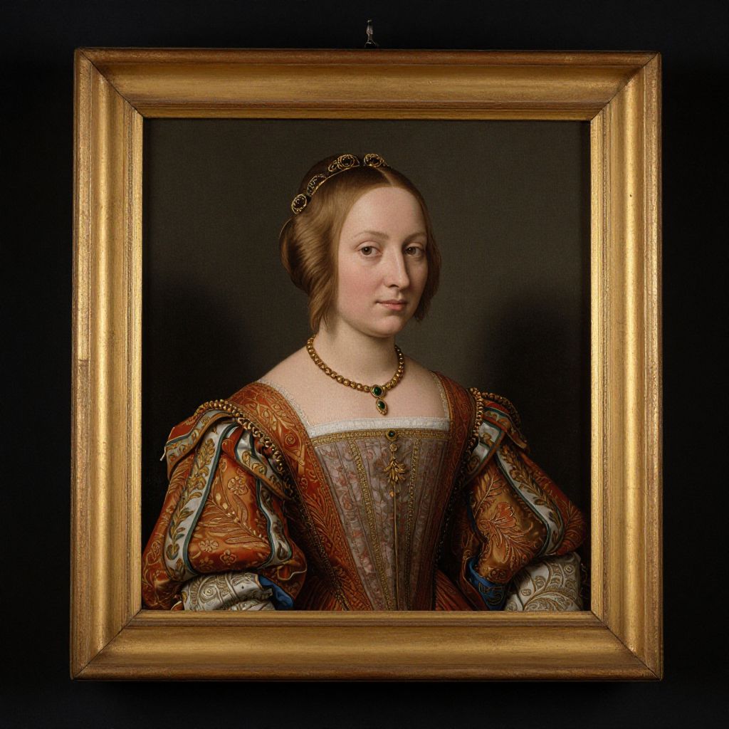 Elegant gold frame encasing a classical portrait of a woman in Renaissance attire, set against a dark background, showcasing intricate details and rich colors characteristic of the German School's style.