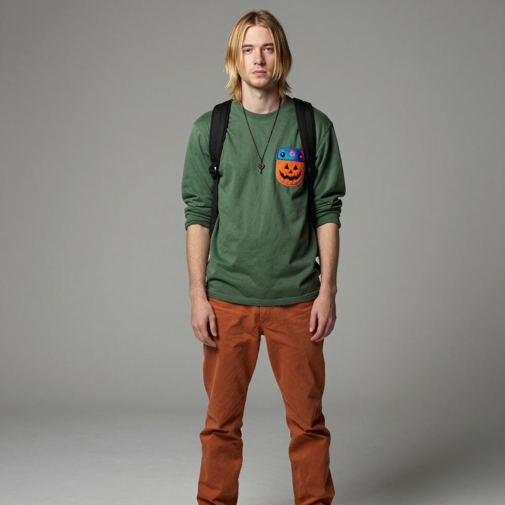 Full body portrait of a young Caucasian man with medium-length blonde hair wearing a green long-sleeve shirt featuring a colorful pumpkin patch on the left chest, orange pants, and a black backpack. He has a necklace with a small pendant, rolled-up sleeves, and a serious expression, standing against a neutral gray studio background.
