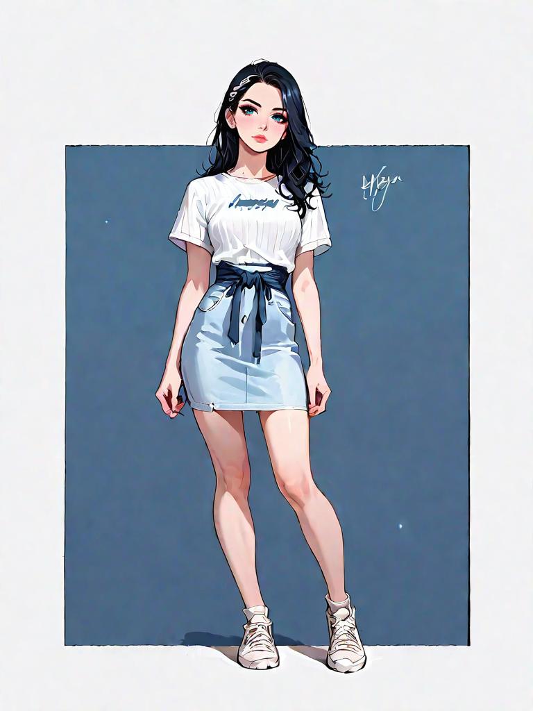 Full body digital illustration of a young woman with long dark hair and blue eyes, wearing a white distressed short-sleeve t-shirt knotted at the waist, paired with a cerulean blue thigh-length pencil skirt with an elastic waistband and a tied bow. She stands against a plain white background with a blue square behind her, sporting white sneakers. The style is realistic with a modern casual look.
