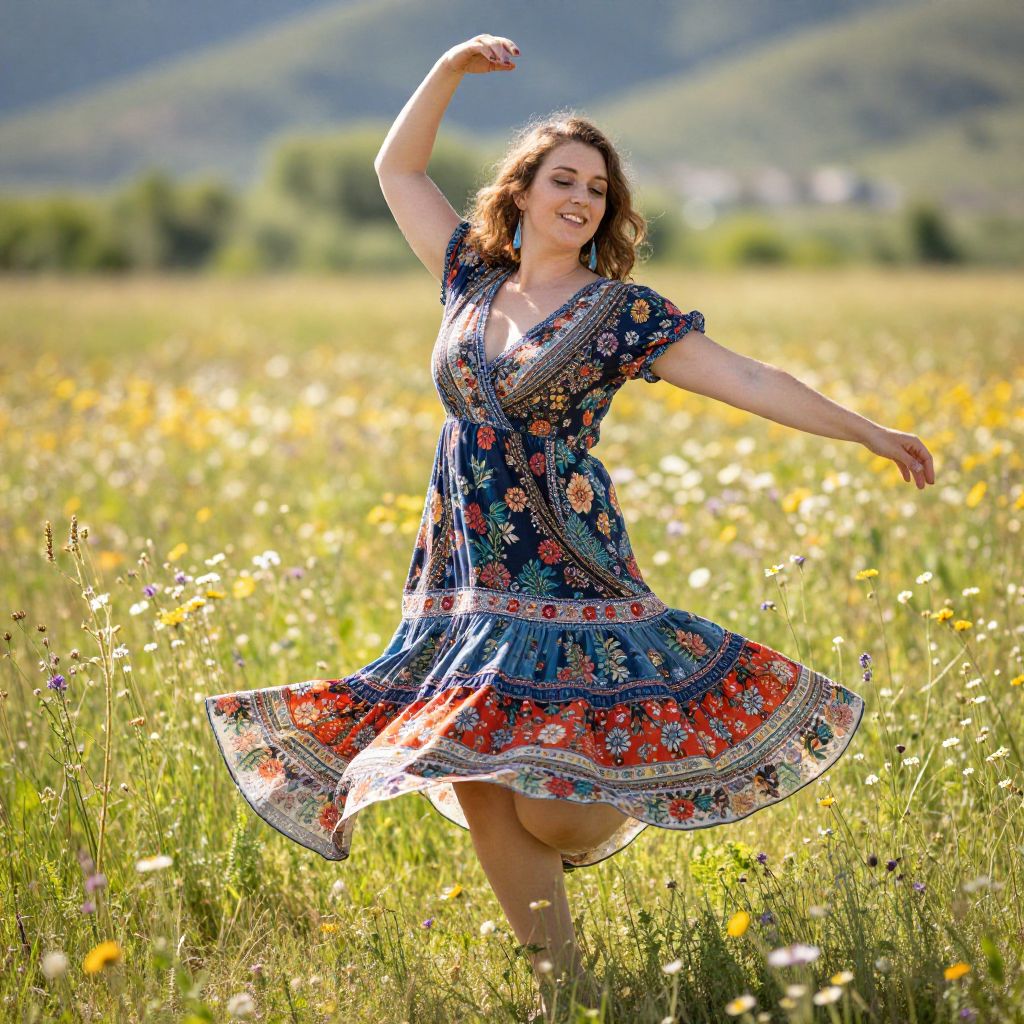 Plus size hourglass woman dancing joyfully in a sunlit wildflower meadow, flowing bohemian dress, carefree movement, bright natural light, rich floral colors, impressionist style background with dreamy blur