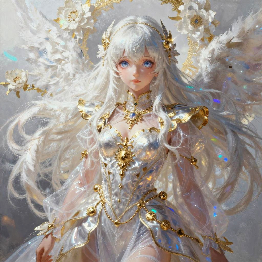 Digital painting of a beautiful white-haired, blue-eyed angelic woman with golden adornments, translucent wings, and ethereal light surrounding her.
