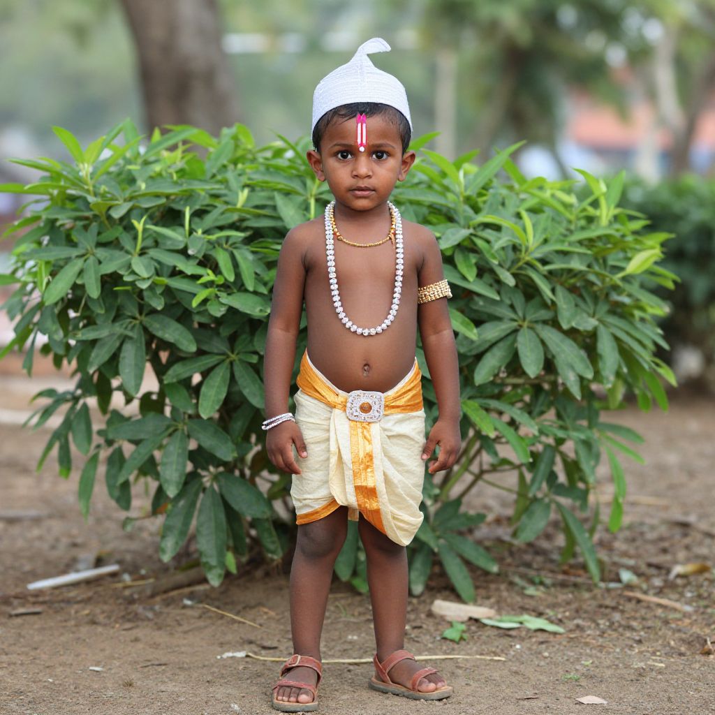 Photograph of a young Indian boy standing outdoors, wearing a white headpiece with a red bindi on his forehead, a white beaded necklace, and an orange and yellow cloth wrapped around his waist, leaving his chest and legs exposed. He has dark skin and wears brown sandals. His right arm has a gold arm band. He stands in front of lush green bushes on a dirt ground, with trees and a blurry background of greenery and indistinct structures. The boy's expression is neutral, and the lighting is natural.