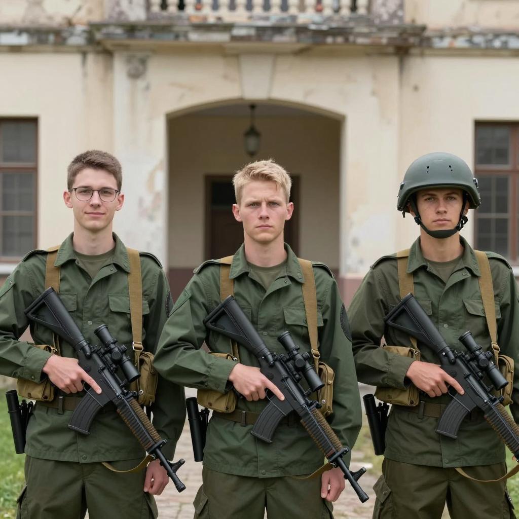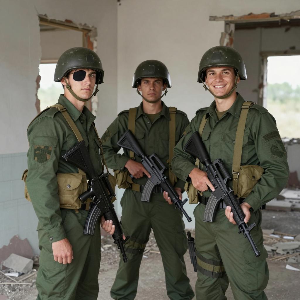 Three male soldiers in green uniforms and metal helmets stand in a ruined building. The soldier on the right smiles, with hand on hip, holding a rifle. The middle soldier looks forward, also holding a rifle. The left soldier stands in profile, wearing a black patch over one eye. Background includes damaged walls and stairs.