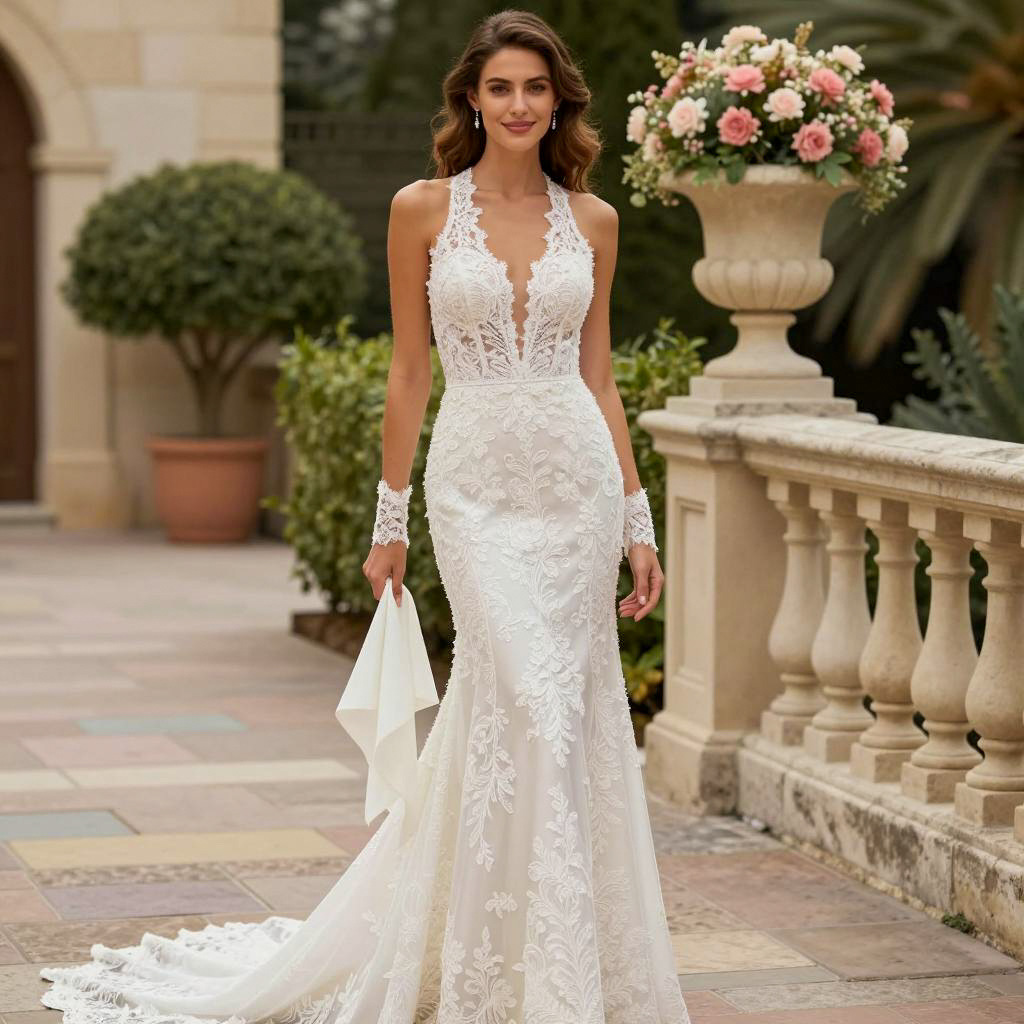 Photograph of a slender woman with wavy brown hair in a deep V-neck, lace, floor-length wedding dress with a halter neck and elbow-length lace sleeves. She holds a white fabric in her right hand, standing on a stone pathway with a stone balustrade to the right. Background includes green plants and a pink flower arrangement. She smiles slightly.