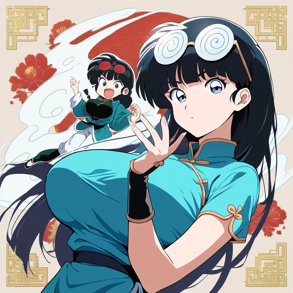 Mousse (ranma 1/2), ranma 1/2, 1girl, coke-bottle glasses, eyewear on head, long hair, black hair, blunt bangs, huge breasts, chinese clothes, chinese clothes, by artist yuki00yo, animagine