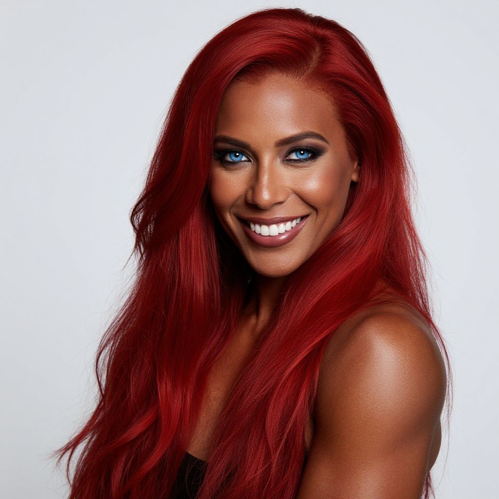 (masterpiece, best quality, ultra realistic, 8k uhd, very high quality, extremely detailed face), dark tan skin, very muscular 30y.o. Egyptian-Japanese woman, smiling and happy, ((bright blue eyes)), absurdly long ruby red hair, muscles, dark skin, ruby red hair