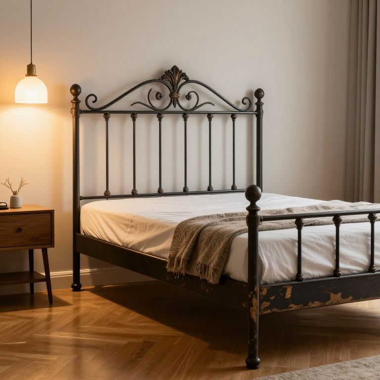 A stylish bedroom interior shot showcasing a dark antique wrought iron headboard with ornate flourishes and a slightly weathered finish, placed against a mid-century modern bed, with a warm pendant light above and a wooden floor that reflects the texture of the metal in soft golden tones.