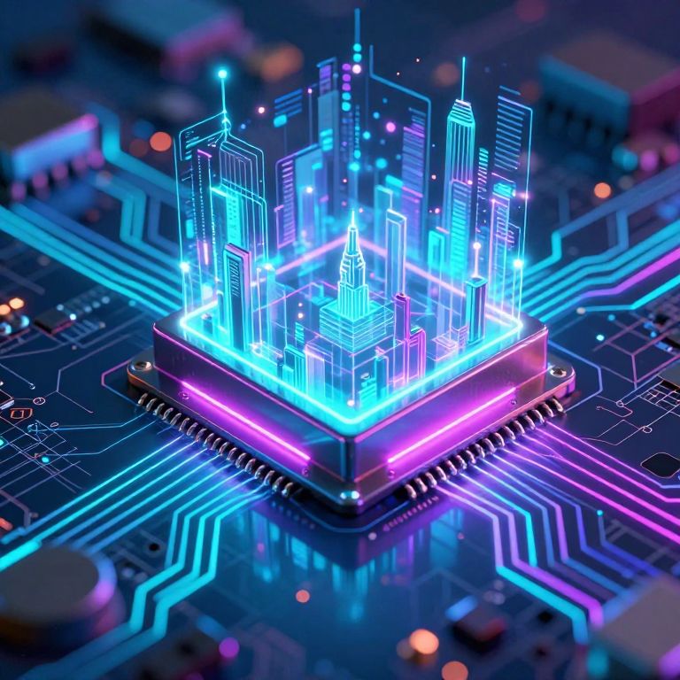 Neon blue and purple digital cityscape on a glowing, futuristic circuit board, with vibrant lines and illuminated skyscrapers. Cyberpunk CGI art.