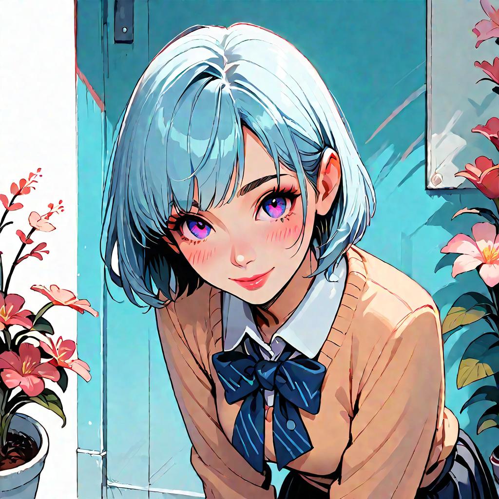 Takabe, score_9, score_8_up, score_7_up, source_anime, 1girl, solo, looking_at_viewer, looking in love, upper eyes, smile, :d, blush, cowboy_shot, school_uniform, arms_behind_back, bent_over