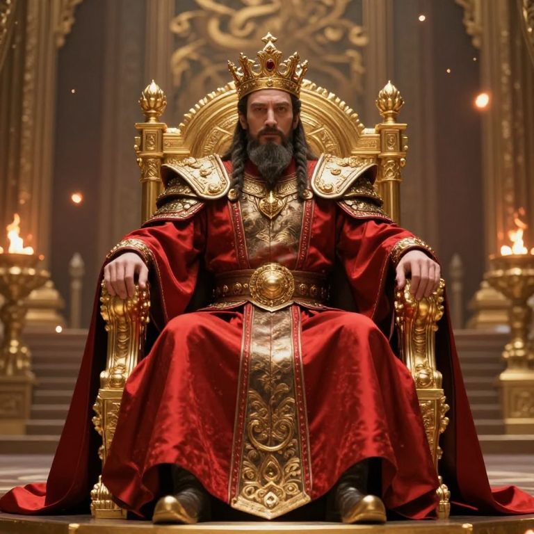 Regal king seated upon an ornate golden throne, draped in a flowing crimson robe and adorned with intricate armor, exudes authority amidst a grand hall illuminated by floating embers.