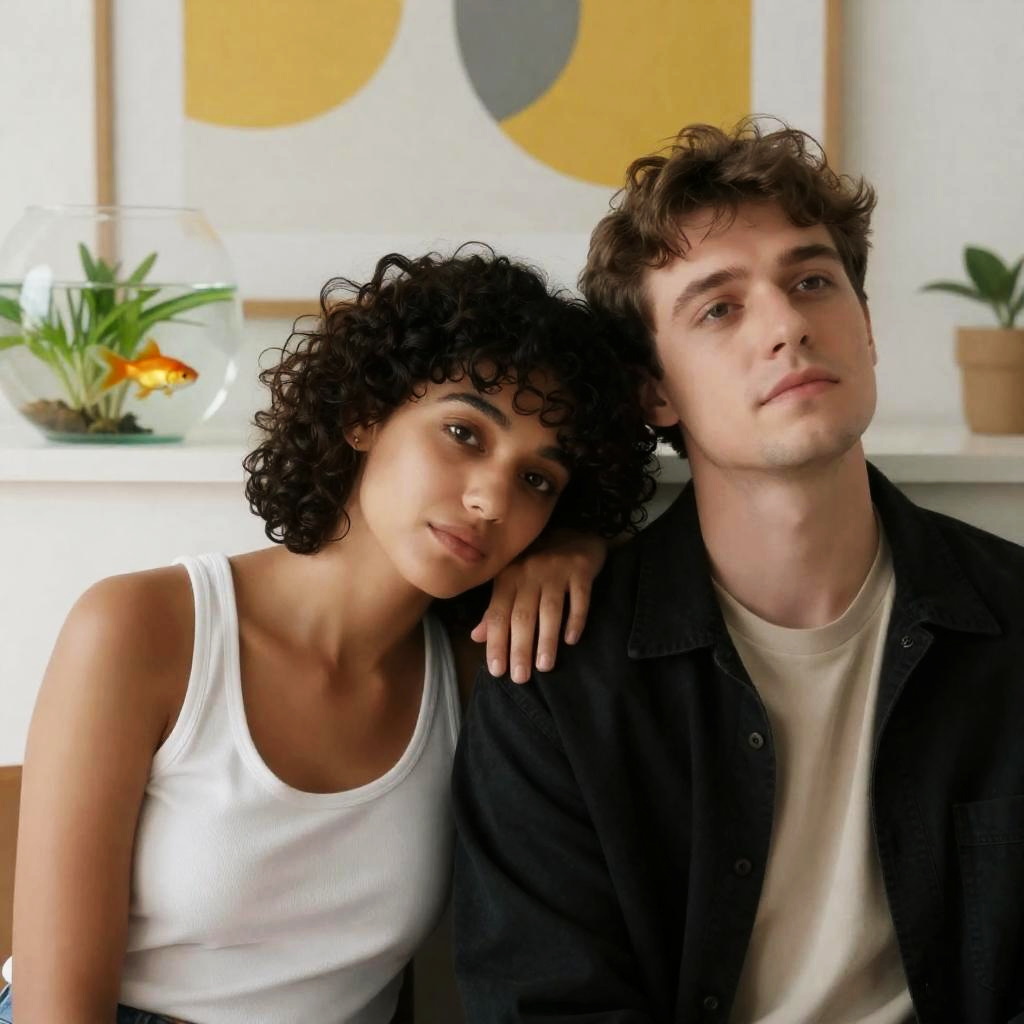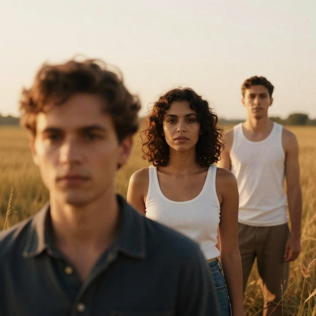 Close-up portrait of three individuals with intense and serious expressions against a warm yellow-orange background. Center features a woman with short curly dark hair, light skin, wearing a white tank top. To the left is a man with short curly hair, light skin, and dark clothing. Another man with short hair, light skin, and a serious look stands to the right. Faces slightly overlapping creating a sense of unity and emotion.