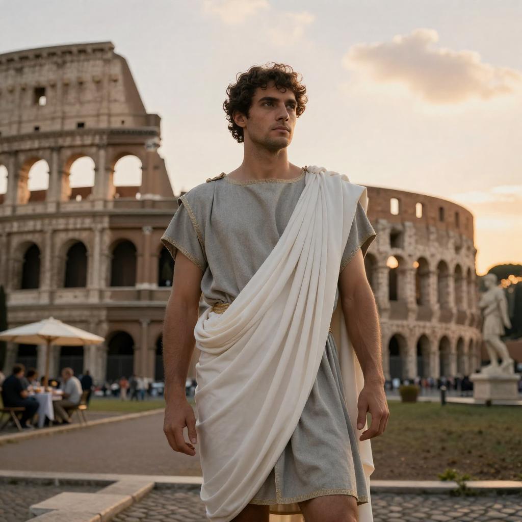 Male with curly dark hair, wearing gray tunic and white toga, holding toga's edge, standing in ancient Roman courtyard. Colosseum in background, golden sunset sky, people at tables with umbrellas to the left, stone statues to the right.