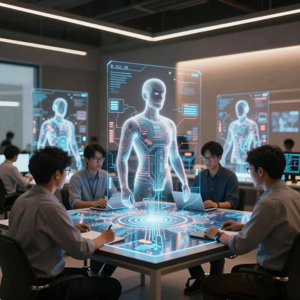 Make ai visualization, a creative workspace with holographic AI models floating above hologram tables, engineers interacting with transparent screens, intricate circuits and data patterns illuminating the background, warm ambient lighting