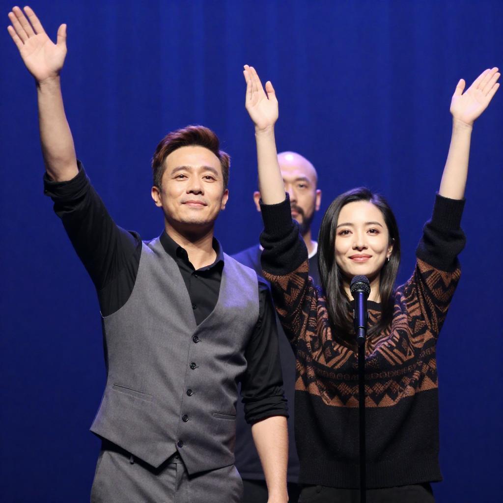 Photograph of an Asian man and woman standing on stage in front of a blue vertical-striped backdrop. The man has short brown hair and is wearing a gray vest over a black shirt, with his right arm raised. The woman has long black hair and is wearing a black and brown patterned sweater, also with her right arm raised. A bald man with a beard is partially visible in the background behind them. A microphone stand is positioned in front of the woman. Both main subjects are smiling and appear to be acknowledging an audience.