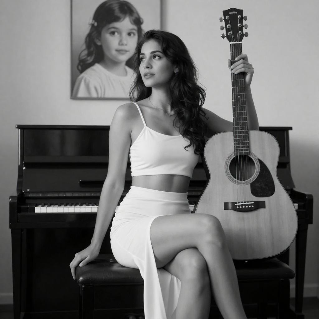 Photograph of a young woman with long brown hair, wearing a white lace-trimmed corset and dark jeans, leaning over a red and black guitar case in a brightly lit garage. She has a focused expression, with a blue car visible in the background. Sunlight streams through the garage windows, highlighting her figure.