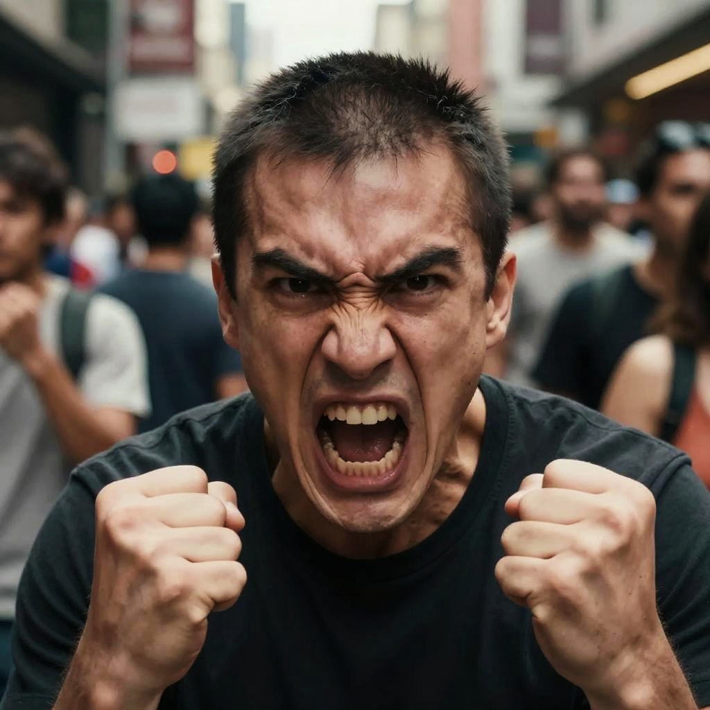 Angryman shouting in a crowded urban street, veins bulging on forehead, clenched fists, intense fiery eyes, dramatic lighting conveying rage, background blurred with chaotic city life, hyper-realistic style