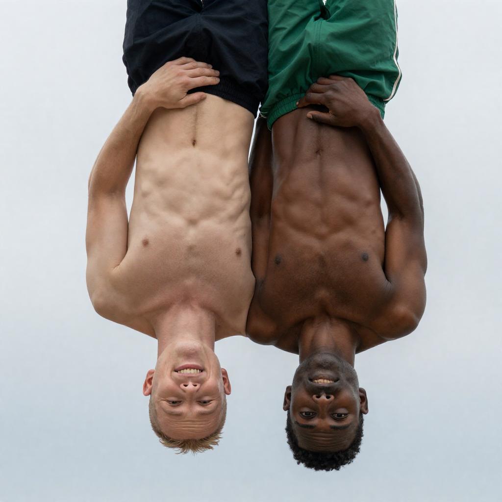 Photograph of two men upside down. Bald, muscular man with pale skin and visible armpit hair holds dark-skinned man with short hair and green shorts. Bald man smiles, dark-skinned man's face partly obscured. Overcast sky background.