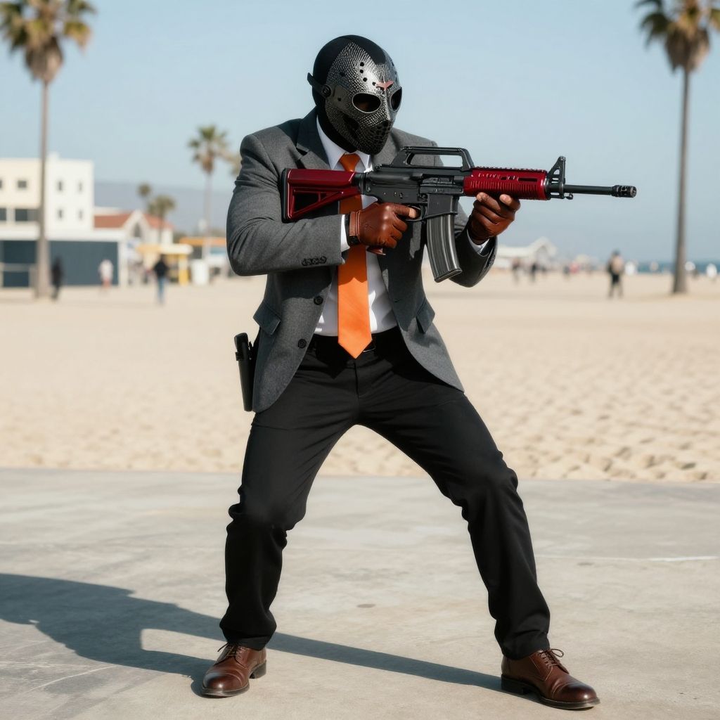 Front 3/4 view portrait of a Armored bank robber handling a metallic red and matte grey assault rifle.The robber is masked with a carbon fiber hockey mask.The robber wears a smart attire. Grey smart jacket, black smart pants, brown smart shoes, brown leather driving fingerless gloves, brigh orange tie on a white office shirt.Dynamic, action, shooting pose.Background of a sunny day at Venice Beach, Los Angeles, California. Many details everywhere. Ray-Tracing. Anti-Aliasing. Realistic reflections. Realistic soft shadows. Slightly desaturated colors. Insane quality. Insane resolution. Insane details. Masterpiece. 16k resolution. Dynamic shot by Simon Stalenhag.