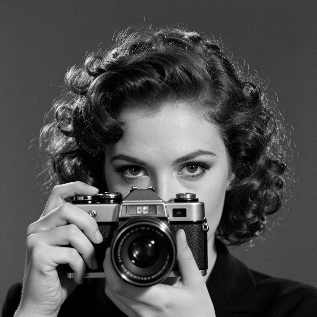 A high-contrast black-and-white photograph of a woman with curly, shoulder-length hair, holding a vintage camera close to her face, aiming it directly at the camera. Her intense gaze is centered on the viewer. She has fair skin and is wearing a dark, possibly velvet, jacket. The camera, with a large lens, is positioned in the foreground, obscuring part of her face. The background is a solid, dark gray, which highlights her features and the camera. The image has a classic, vintage feel, reminiscent of mid-20th-century portrait photography.