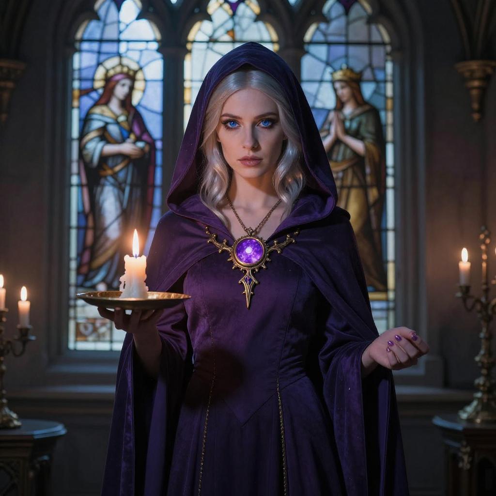 A mystical woman with silver hair and striking blue eyes stands in a gothic room illuminated by candlelight. She wears a dark purple hooded cloak and an ornate necklace featuring a glowing purple orb. Behind her, a stained glass window depicts angelic figures, enhancing the magical and enchanting atmosphere of the scene.