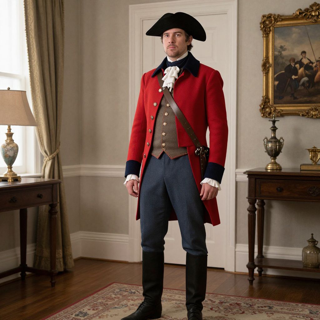 "American Revolution Patriot Costume, man in a red coat and hat standing in a room"