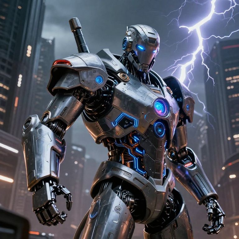 Digital artwork of a futuristic, silver-toned humanoid robot standing in a dark, stormy cityscape. The robot has a muscular build with glowing blue circular lights on its chest, shoulders, and arms. Its head is helmeted with a blue-lit visor. Lightning illuminates the background, casting a dramatic glow over the tall, illuminated skyscrapers. The robot's design is sleek with angular, metallic plating and red accents on its shoulder joints. The overall scene is dynamic, with the robot appearing powerful and ready for action amidst the thunderstorm. The style is hyper-realistic with a sci-fi theme.