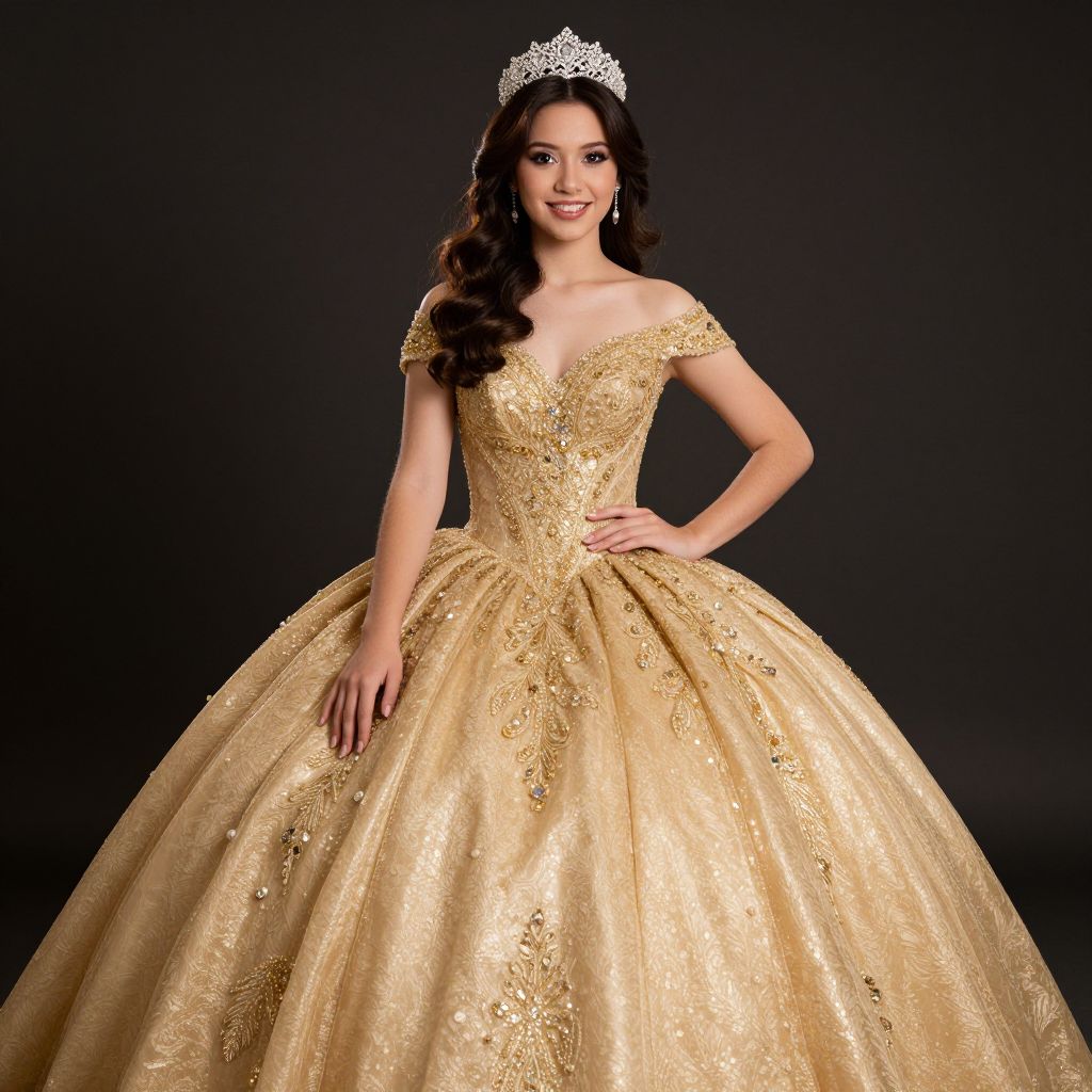 Radiant young woman in a glamorous gold quinceañera gown, adorned with sparkling embellishments and a matching tiara, stands gracefully against a dark backdrop, exuding elegance and celebration.